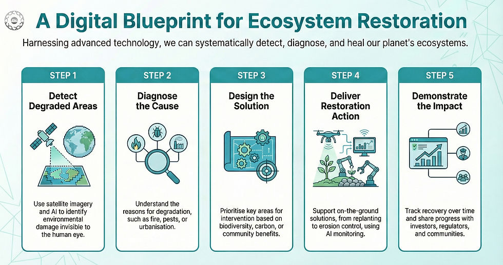 Platforms such as Google Earth Engine, Restor. eco and Copernicus Open Access Hub enable this entire cycle with minimal cost, democratising access to environmental intelligence.